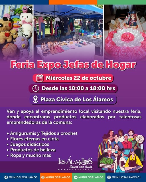 La Municipalidad de Los Álamos invita a la comunidad a participar en la Feria Expo Jefas de Hogar, que se realizará el próximo miércoles 22 de octubre, desde las 10:00 hasta las 18:00 horas, en la Plaza Cívica de la comuna.