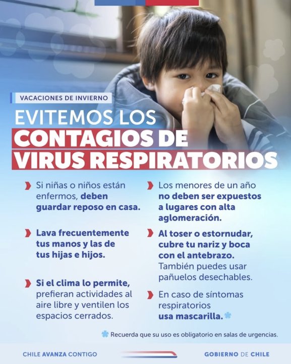 “El grupo más afectado son los niños y niñas entre 1 y 4 años. Por eso, pedimos a padres, madres y cuidadores reforzar medidas como el lavado frecuente de manos, el uso de mascarilla en caso de síntomas -incluso dentro del hogar- y la ventilación de espacios. Si un niño presenta respiración rápida, hundimiento de costillas, silbidos en el pecho, apertura de orificios nasales al respirar o labios azulados, deben llevarlo de inmediato a un servicio de urgencia”, enfatizó la autoridad sanitaria.